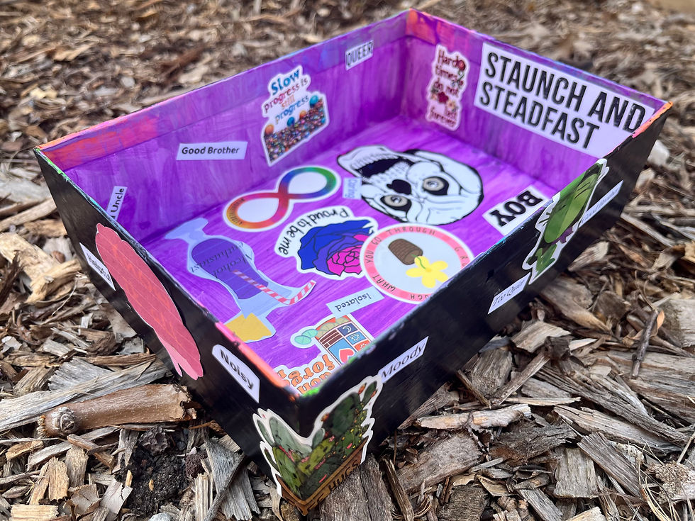 “I painted this box black on the outside to represent the front I put on when I meet people. Even though I’m a people pleaser, I put up a tough exterior. Inside, I chose a purple glittery colour because I can be eccentric, but that depends on how I am feeling. There are a few things on the inside that are on the outside, as I know some people see me how I feel about myself.”